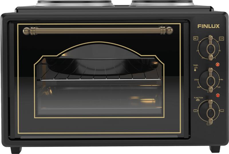 Finlux FMC-9705GB kis tűzhely, 1600 W, 45 l, két égőfejes, üvegajtós, lágy záródású, retró dizájn, fekete