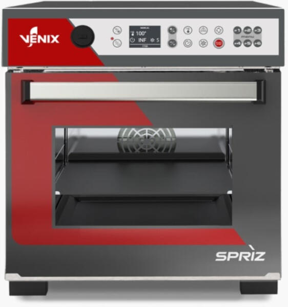 Pizza szettel szállítva A Venix Spriz nagy sebességű légkeveréses sütő tökéletes választás bárok, kávézók, foodtruckok és olyan éttermek számára, ahol gyorsaságra és hatékonyságra van szükség. Ezt az innovatív sütőt arra tervezték, hogy percek alatt finom ételeket süssön, így ideális olyan felmelegítendő ételek sütéséhez, mint a pizzák vagy szendvicsek. Akár 10-szer gyorsabban süt, mint a hagyományos sütők. T öbb fejlett hő- és légtechnikai megoldást kombinálva biztosít gyors és jó minőségű sütést. Színes, 2,4 hüvelykes LCD kijelzős digitális vezérléssel, 100 beépített programmal. Nagy belső térrel, helytakarékos kialakítással, biztonságos dupla üvegezésű ajtóval és többnyelvű szoftverrel. Az egyszerű tisztítás érdekében lekerekített élekkel és beépített ételmaradékgyűjtő tálcával. Nagysebességű ventilátoros légkeveréssel. A sütőt egyszerűen csatlakoztathatja okostelefonjához vagy táblagépéhez. A beépített USB porton kerüsztül egyszerű a receptek gyors feltöltése/letöltése. Beépített WI-FIvel és felhő támogatással a távoli támogatáshoz és karbantartáshoz. Jellemzők: